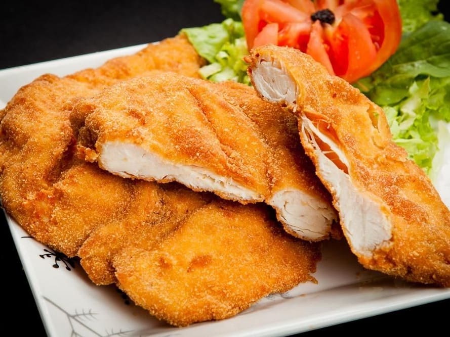 Arroz Branco, Feijão em Caldo, Salada, Batata Frita e Filé de Frango à Milanesa